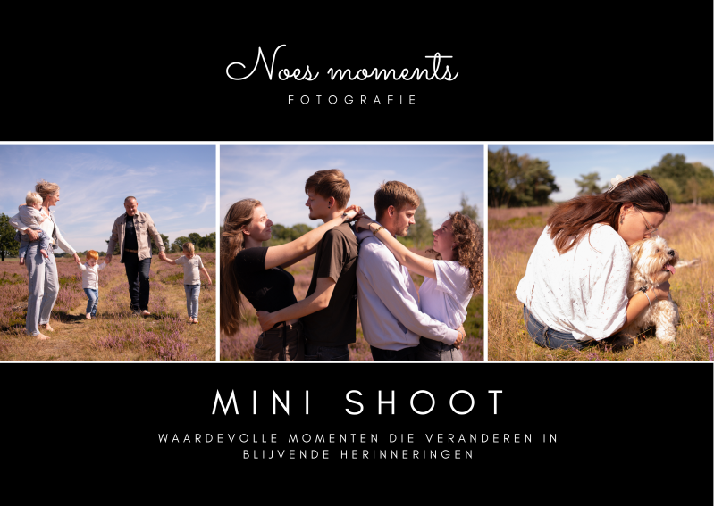 Met onze cadeaubon verras je iemand met een minishoot van 45 minuten, inclusief 5 foto’s. Wil je meer mooie herinneringen? Extra foto’s zijn bij te bestellen voor slechts €5,- per stuk.